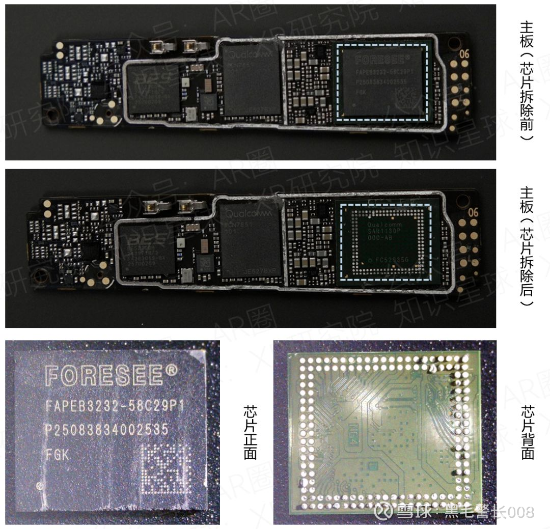 拆解发现,小米AI眼镜采用了江波龙的ePOP4x存储方案。根据江波龙官方信息,ePOP4x采用了创新的封装技术和高度集成设计,其最大厚度仅为0.6mm,相比上一代0.8mm厚度产品减少了近25%,是当前市场上最薄的ePOP产品之一。