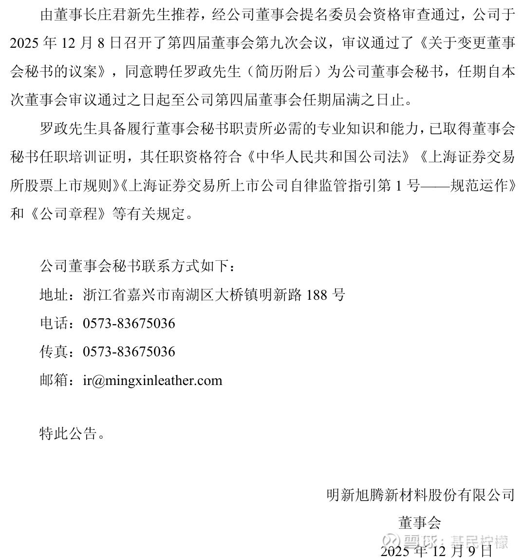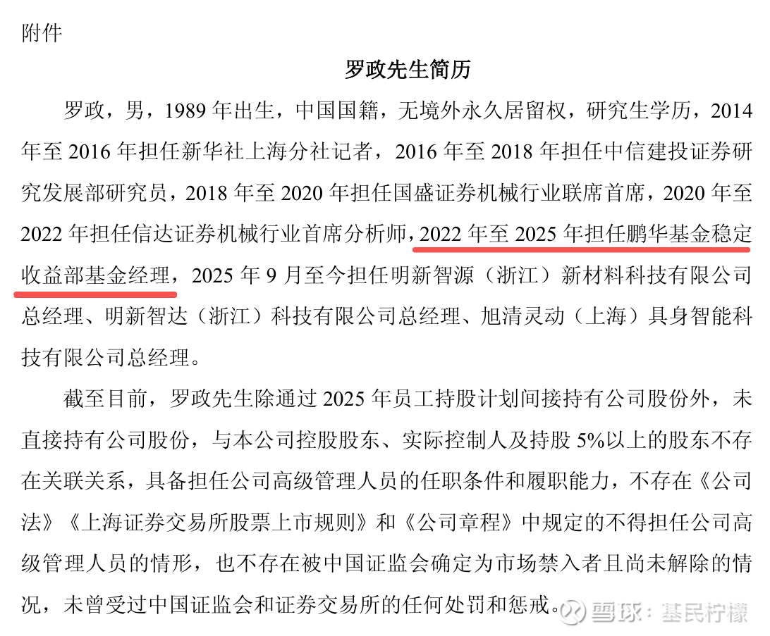 罗政2025年9月至今担任明新旭腾旗下明新智源(浙江)新材料科技有限公司总经理、明新智达(浙江)科技有限公司总经理、旭清灵动(上海)具身智能科技有限公司总经理。此番再获董秘新身份。