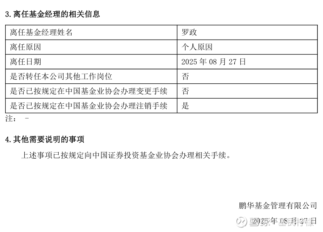 因个人原因,罗政于2025年8月27日离任$鹏华弘泽混合A(F001172)$ 、$鹏华丰和债券(LOF)A(F160621)$ 、鹏华上华一年持有期混合(013353)、鹏华宁华一年持有期混合(011414)的基金经理。