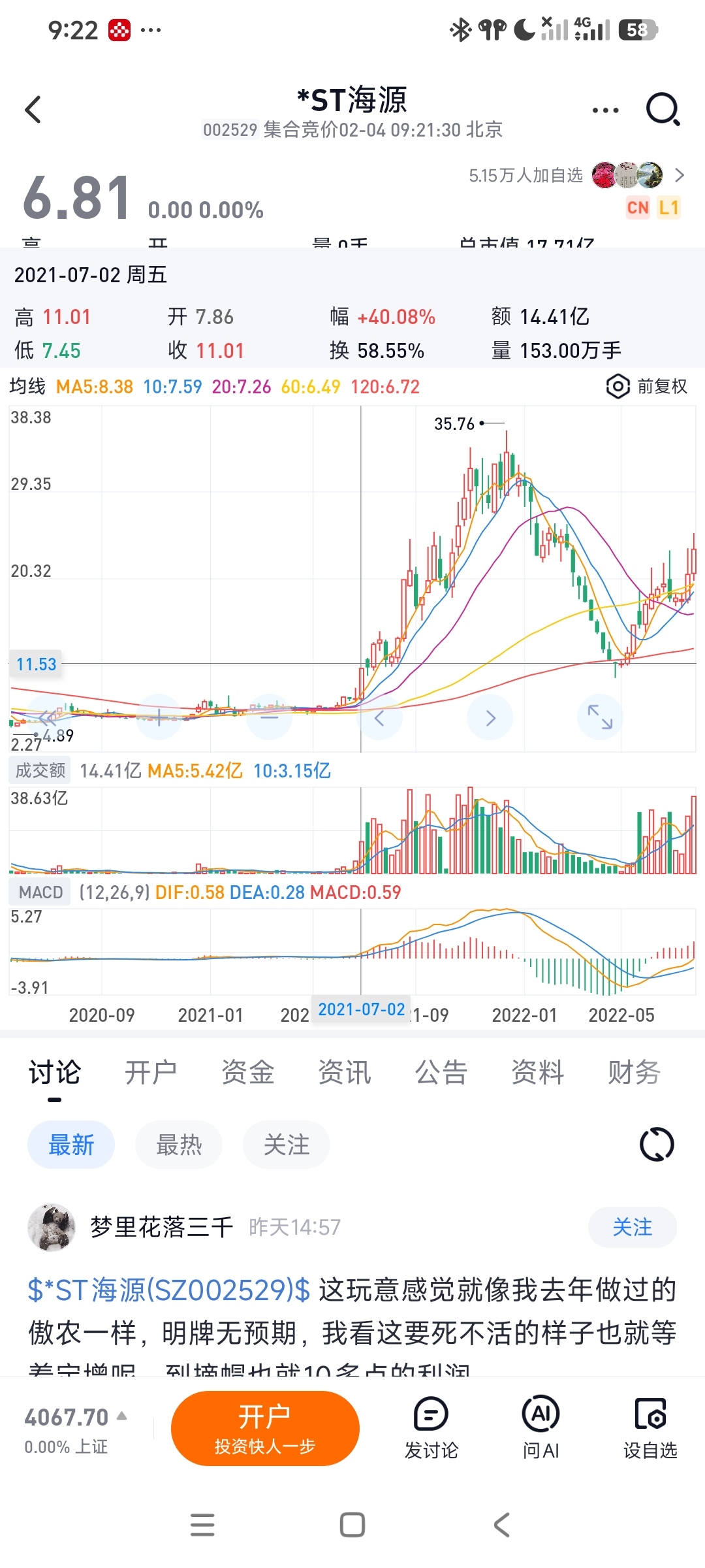 $太极实业(SH600667)$ $*ST海源(SZ002529)$ 我21年入股市的时候量化还不多,那时候我做过一个票叫海源复材,当时我记得是新能源很火,它应该是搞光伏的,一个预期差很大的股票。那个时候大概是11元,我研究了2天,觉得后面会有很热门的重组故事,实控人叫甘胜泉,市场对公司有资本运作预期,但是大部分人还没注意到。 当时我很激动,那时候是困境反转,股价还在底部,趋势向上,随时拉升。 那天,我把准备买车的钱一把梭了进去,当天股价没有反应,我很焦虑。次日开盘,突然有很多大单涌入直线拉升,直接就涨停板了,那个时候我开心坏了。想着连板应该开始了。 第二天,一个小低开,我自信格局,庄家诱空罢了,然后啪一个跌停。我愣住了,我想一个又逻辑的股是不会这么走的,然后微赚清仓。之后,股价横了1周,突然又拉升十几个点,我拍大腿只喊错过了。然后股价又横盘了一周,又阴了一周回到拉升前,我想着,垃圾股,果然不行,不碰。然后两周内连续巨阳拉升,彻底脱离原来的台阶,这下我知道,再也买不回来了,我已经没了心气。