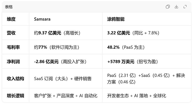 $涂鸦智能(TUYA)$ 最近看了一下美股的IoT龙头Samsara,这样一个还没盈利的公司,营收也就是涂鸦的3倍,市值195亿美元。而涂鸦智能的市值只有他的1/15,感觉合理估值下,涂鸦智能如果是美国的公司,市场给个四五十亿美金的估值是没一点问题的...