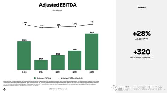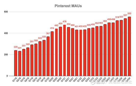 此外,Pinterest 目前拥有 5.53 亿月活跃用户(MAU),并且继续超越新冠疫情高峰时期的水平,假日季连续增长了 1600 万,是多年来最强劲的一次。截至 2024 年末,该公司的 MAU 增长率约为 11%。