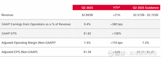 天弘科技第二季度业绩表现强劲,营收较分析师预期高出2亿美元,每股收益较预期高出0.16美元。从同比增速来看,营收增长21%,这是一项非常出色的业绩。更令人瞩目的是利润率领域的增长——以经调整营业利润率为代表,该指标上升了110个基点。这意味着天弘科技在实现更快增长的同时,成本效益也在提升。因此,未来增长较有可能同步带来更高利润。
