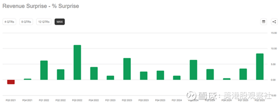 其次,营收表现与此类似——过去15个季度中,天弘科技营收持续超出市场预期。