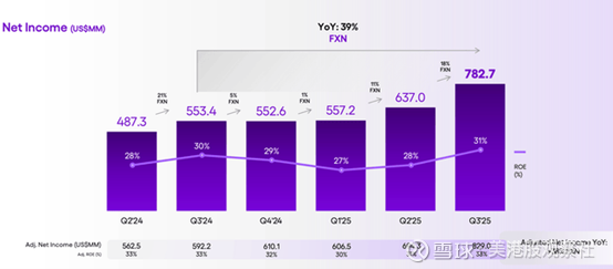 增长动能并未放缓。2025年第三季度,在剔除汇率波动影响(货币中性基础)的情况下,公司营收增长39%,达到42亿美元。信贷组合规模达304亿美元,上季度在固定汇率下增长42%。同期,有抵押贷款同比增长133%,无抵押贷款同比增长63%。