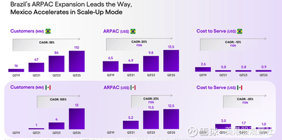 出色的财务表现背后,是其优异的单位经济效益。巴西是Nu Holdings最成熟的市场,且领先优势显著——在巴西市场,公司的月均客户服务成本仅为0.90美元,而最新季度的活跃客户平均收入(ARPAC)达到13.50美元。