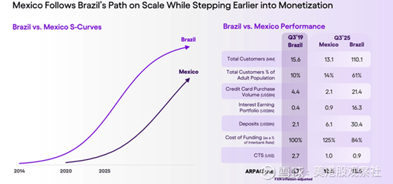 对于Nu Holdings而言,墨西哥和哥伦比亚仍是相对新兴的市场,但公司已在这两个市场取得显著进展。在墨西哥,Nu Holdings的客户数已超过1300万,覆盖近14%的成年人口;截至第三季度末,哥伦比亚市场的客户数也达到了400万。
