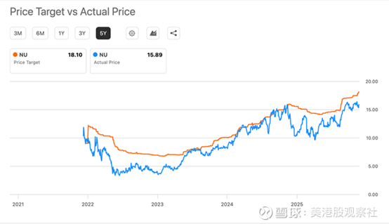 跟踪该股的分析师给出的平均目标价为18.10美元,而当前股价约为16美元——这意味着,相较于华尔街平均目标价,Nu Holdings的估值被低估了14%。
