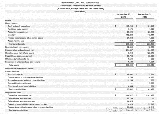 首先我们来聊聊Beyond Meat近期最受关注的动态:其巨额债务的重组事宜。下图展示了截至9月季度,Beyond Meat最新公布的资产负债表情况: