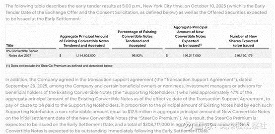 如下图所示,Beyond Meat将现有可转换债券中本金价值11.1亿美元的部分(约占现有债务的97%)进行交换,换取了1.962亿美元将于2030年到期的可转换债务,票面利率为7%,且采用“paid in kind”方式——这意味着Beyond Meat无需以现金支付利息,而是将应计利息计入债券本金。此外,相关费用也计入本金,最终新债务的初始余额总计为2.087亿美元。