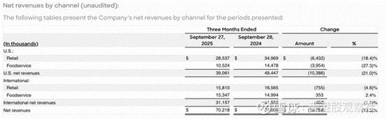 公司最大的问题仍集中在美国餐饮服务业务,该业务约占总营收的14%。第三季度,其通过餐厅渠道销售的产品收入同比下滑27%,降至3910万美元。这一数据清晰表明,Beyond Meat正面临宏观经济压力——尤其是在第三季度财报季中,Chipotle、CAVA等连锁餐饮企业均公布了疲软业绩。在当前宏观环境下,不会有太多消费者既选择外出就餐,又愿意为Beyond Meat的植物蛋白产品支付溢价。