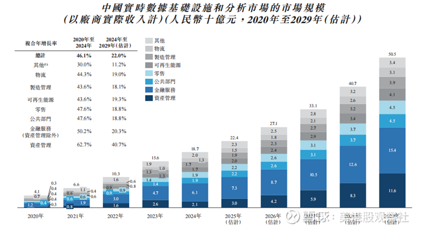 从行业规模来看,中国实时数据基础设施及分析市场正处于高速增长阶段。根据弗若斯特沙利文报告,2024年中国实时数据基础设施及分析市场规模已达187亿元,2020年至2024年复合年增长率为46.1%;在国家“数字中国”战略推进、AI技术应用等促进下,预计到2029年,市场规模将增至505亿元,2024年至2029年复合年增长率仍达22.0%,增长动力强劲。其中,资产管理细分行业将保持40.7%的复合年增长率,到2029年规模将达到116亿元,高于行业整体的增速。