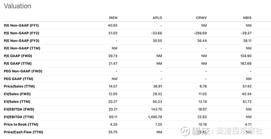 从上图可以看出,以远期估值指标衡量,IREN是板块内估值最低的公司之一——远期EV/销售额为12.0倍,远期EV/EBITDA为20.2倍。相比之下,Applied Digital的远期EV/Sales为29.3倍、远期EV/EBITDA达143.7倍;Nebius的远期EV/Sales也高达40.3倍。CoreWeave的估值与IREN最为接近,其远期EV/Sales为11.0倍、远期EV/EBITDA为18.1倍。