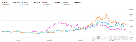 IREN在2025财年股价涨幅达到约308%,该股不仅大幅跑赢大盘(2025年大盘涨幅为14%),其涨幅同样领先于一众新兴云服务同业公司——同期Applied Digital上涨了 260%,CoreWeave上涨了 98%,Nebius 上涨了 195%。展望2026财年,该股前景将更为光明。接下来我们来具体分析背后的原因。