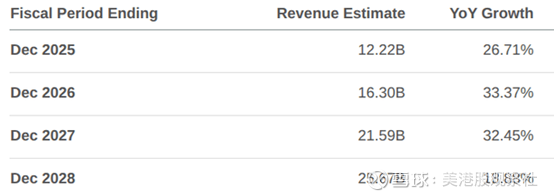 不过,随着营收规模从2025年的约120亿美元增长至2027年的超210亿美元,即便估值倍数不进一步扩张,预期市销率也将自然回落。以当前销售额衡量看似高昂的估值,在营收以年均30%以上增速复合增长的背景下,将变得远为合理。
