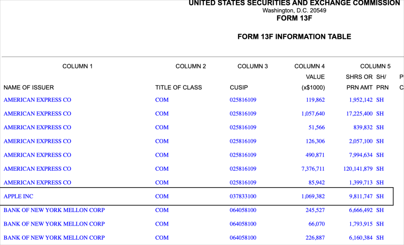 伯克希尔第一次公开披露对苹果的持仓,出现在2016年Q1的13F: