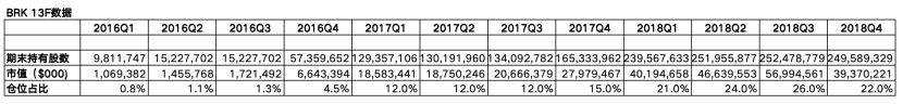 2018年全年,伯克希尔知行合一,在iPhone X系列销量不及预期带来的股价调整中保持加仓节奏;从年初加仓到年底。到了年底已有2.49亿股,市值393.7亿;仓位占比增至当时1830.6亿美金总仓位的22%。