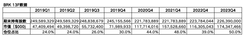 整个2020-2023年,尽管市场经历了2020年年初的“熔断”、量化宽松流动性泛滥后的全面反弹以及俄乌冲突及美联储激进加息带来的收缩,伯克希尔对苹果的持仓始终没有发生特别大的变化。但随着苹果的股价持续超出组合整体表现的上涨,其仓位已经从2019年末的30%上到了2023年末的50%。