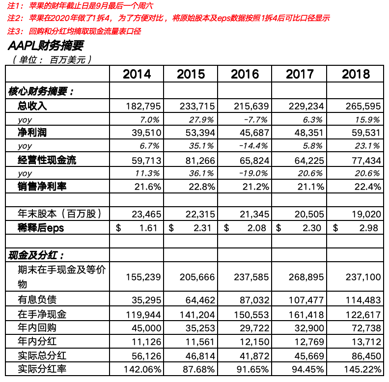 当年的苹果收入2337亿美金,净利润534亿美金。46.3%的ROE,22.8%的净利润率。账面现金扣除有息负债1412亿;现金流非常好,且净利润几乎全部以分红+回购的形式回馈股东。