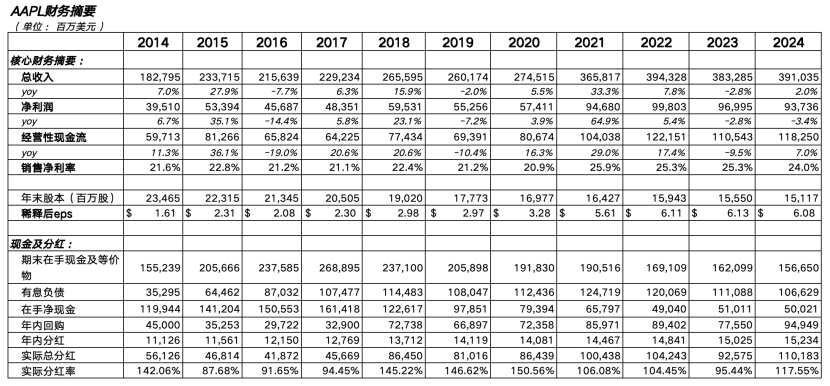 回顾整个2014财年到2024财年的周期,苹果的收入CAGR其实只有8%;净利润CAGR 9%,而稀释后每股收益的CAGR则达到了14%。