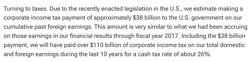 减税法案的落地与苹果加速回购的政策之间存在直接联系。在2018财年Q1的业绩会上,CFO Luca Maestri提到,苹果预计将一次性向美国政府支付380亿美金,以将过往留存在海外的利润汇回国内。