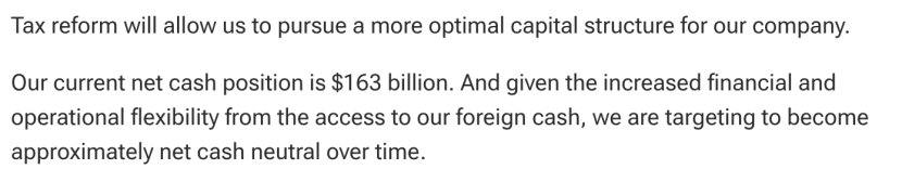 这也是苹果第一次正式向投资者提出“现金中和(net cash neutral)”的资本配置目标。