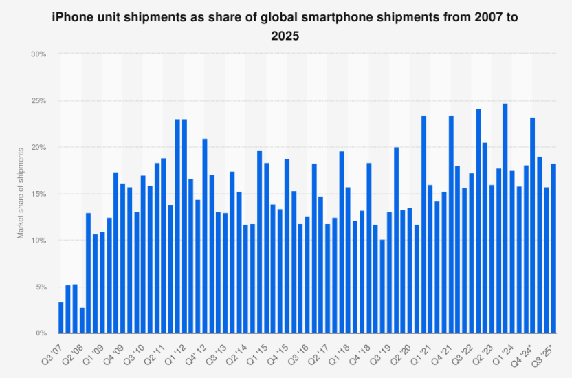 (图:从出货量角度,苹果的市占率多年来提升并不显著)