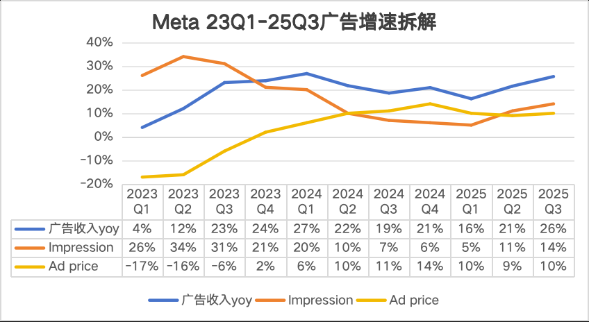 Meta2023Q1广告增速一度降至4%,后明显提速;一直到2025Q3都呈现出“大象起舞”: