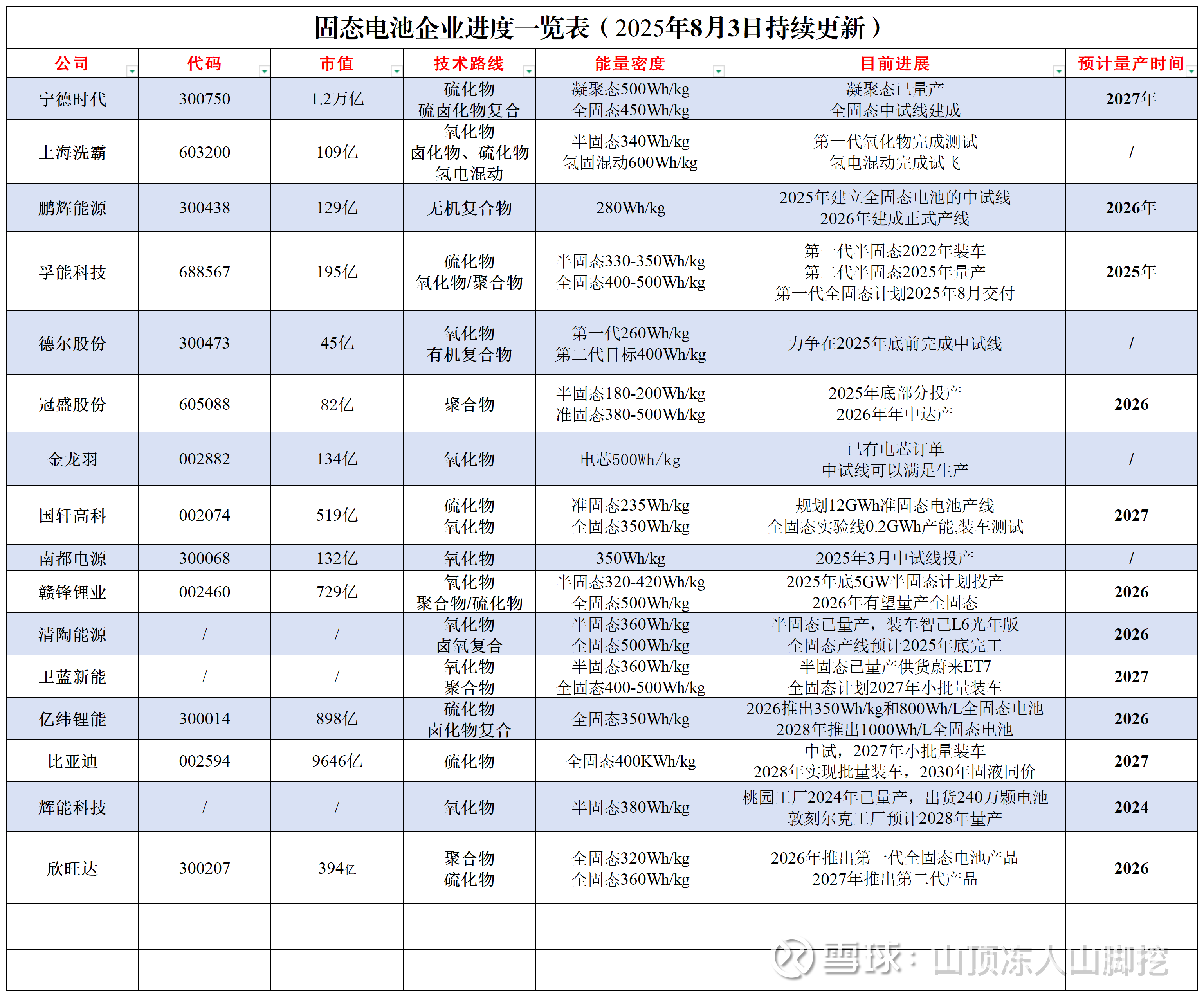 六、国内固态电池公司量产进度表