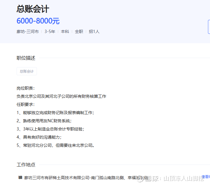高薪招聘有经验的电池材料销售工程师,职责明确为“客户开发、商务谈判、合同执行”。招聘总账会计要求“熟练使用用友NC系统”且具备“制造业总账经验”,说明河北生产基地的财务核算已进入复杂、规范的制造业阶段,绝非实验室规模,已涉及原材料采购、生产成本核算、存货管理等,是正式生产的标志,同时表明公司业务量在增长,急需开拓市场和规范财务管理。