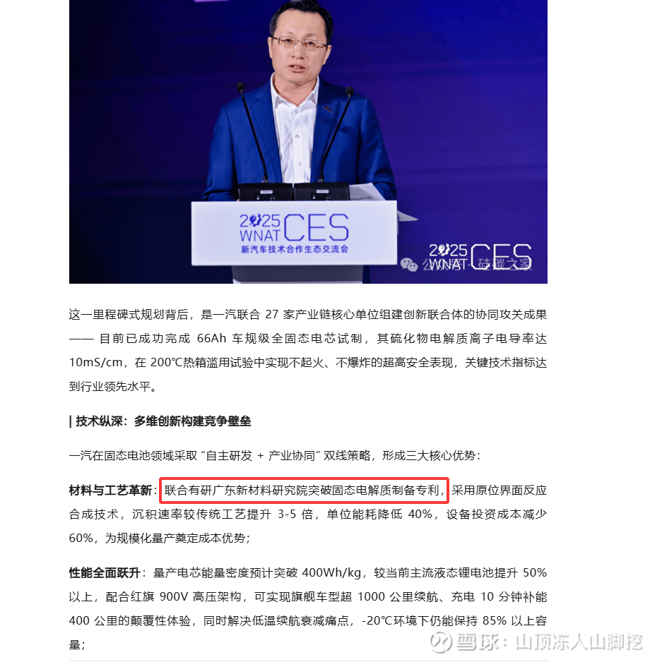 查阅资料显示,中国一汽的固态电池,是联合有研广东新材料研究院,共同研发的,突破固态电解质制备专利。