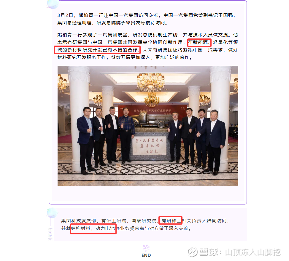 此外,有研集团和中国一汽交流也不少,2022年有研集团总经理熊柏青赴中国一汽访问交流,提到在新能源、新材料方面的合作。而且有研稀土相关负责人陪同访问,并就结构材料、动力电池等业务契合点与对方做了深入交流。