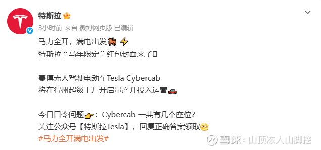 2026年2月9日,特斯拉微博消息,赛博无人驾驶电动车Tesla Cybercab将在得州超级工厂开启量产并投入运营。