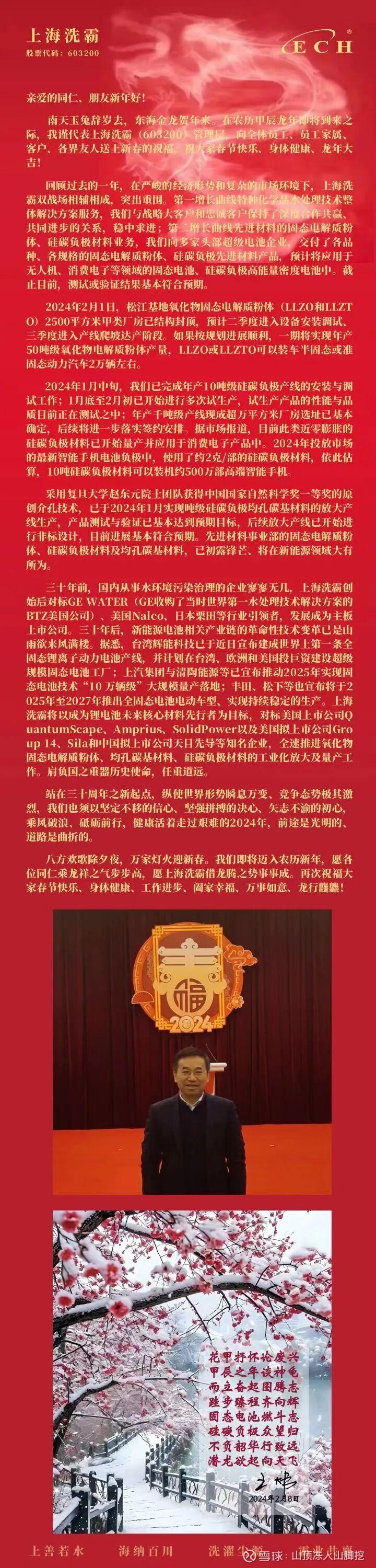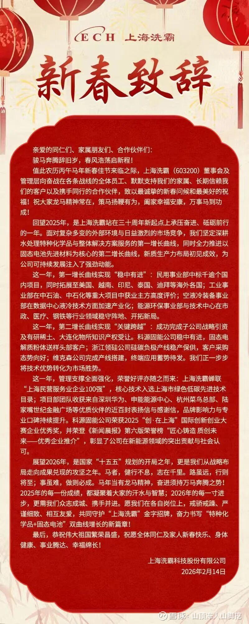 2026年2月14日,上海洗霸官微发布新春致辞,关于新能源业务主要有以下描述。