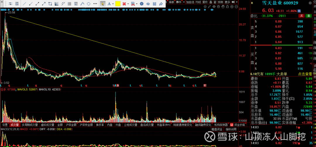 雪天盐业从2018年的23元跌到2026年的6元,跌幅同样超70%,底部横盘达到8年之久。