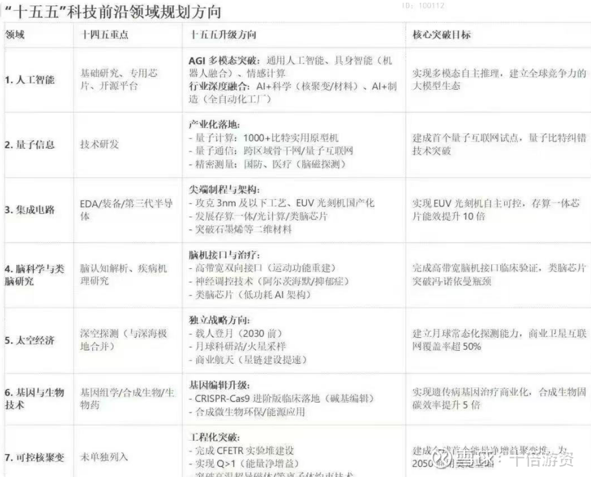 十四五规划明确了七大科技前沿攻关方向,包括新一代人工智能、量子信息、集成电路、脑科学与类脑研究、基因与生物技术、临床医学与健康、深空深地深海和极地探测,这七个方向都成为过去几年炒作的热点题材。