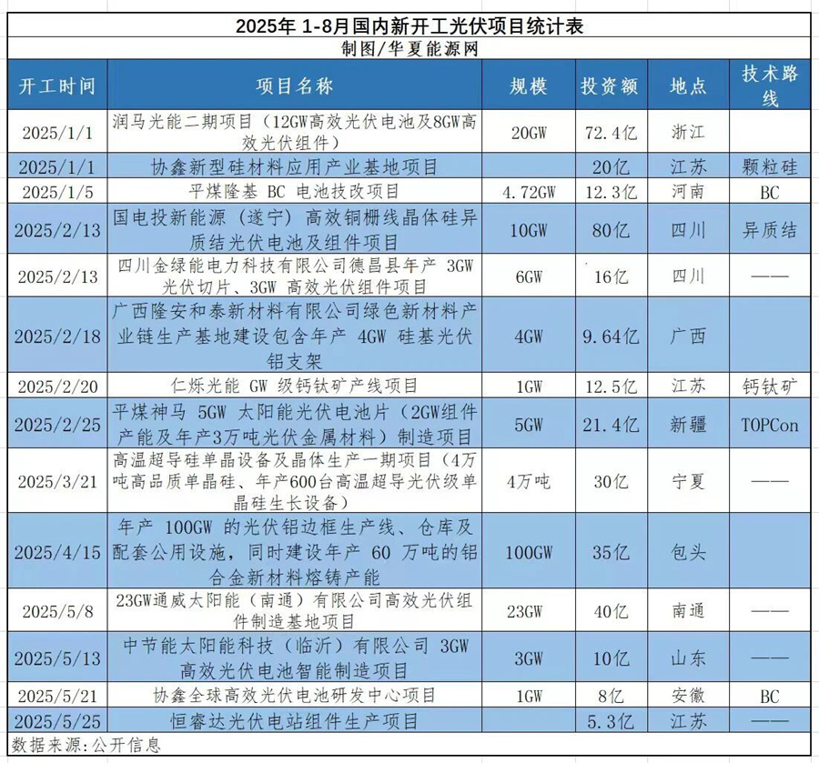 华夏能源网粗略统计,从今年年初至8月20日,国内新增拟上马和新开工光伏项目共计46个,涉及产能超237GW,投资总额超800亿元。