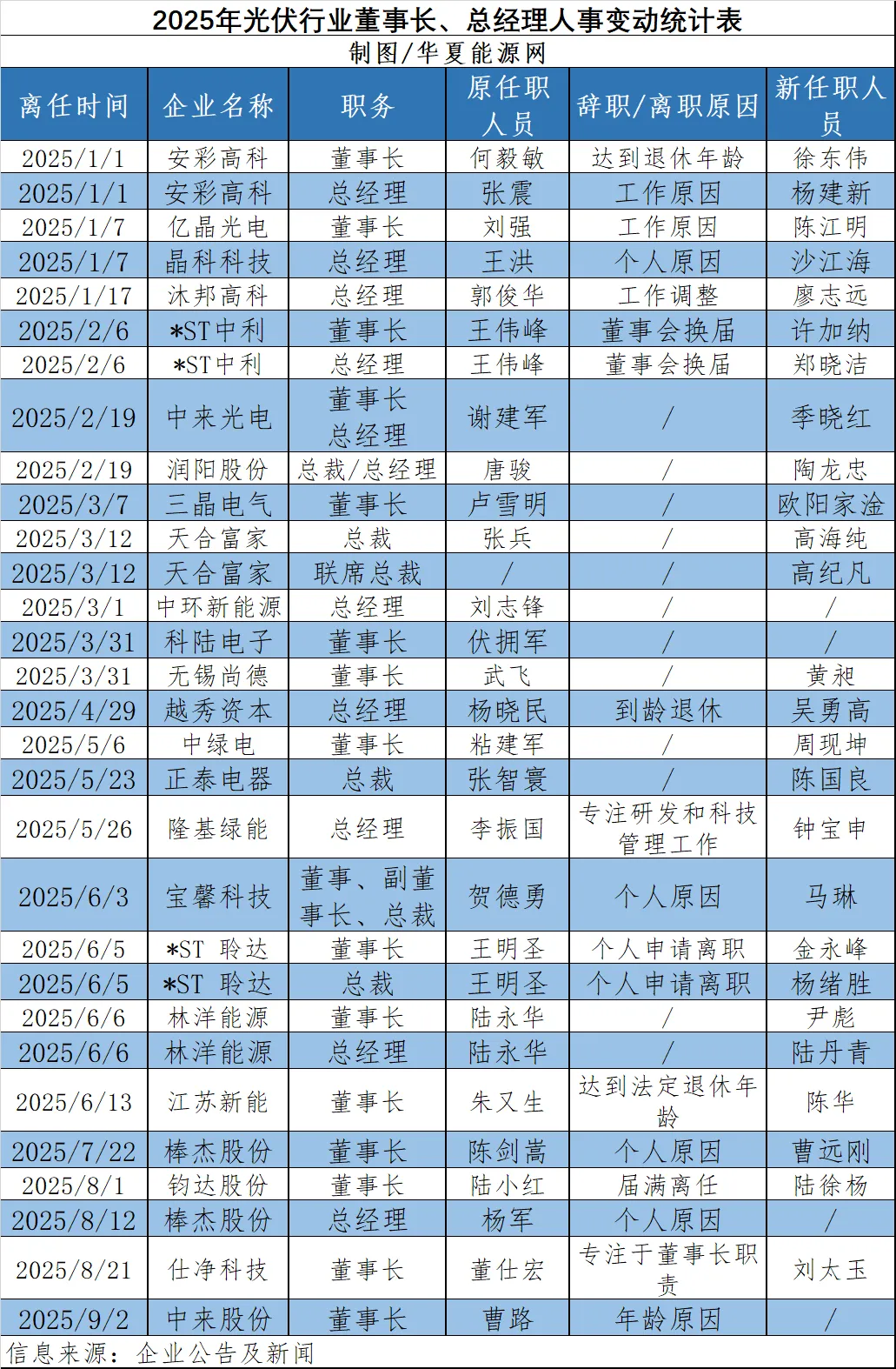 华夏能源网获悉,9月2日,中来股份(SZ:300393)发布公告称,曹路申请辞去董事长、董事等职务,辞职后,将不在公司担任任何职务。
