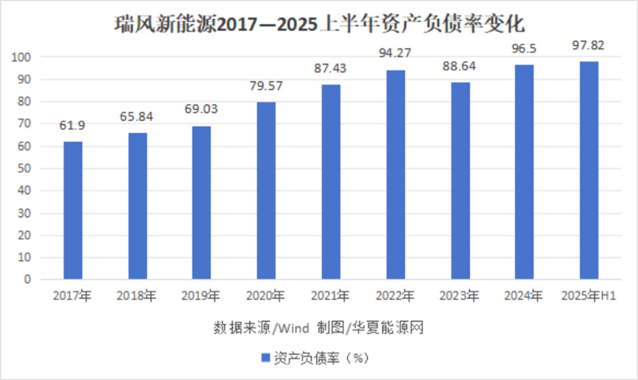 与此同时,瑞风新能源的资产负债率节节攀升。截至2025年6月末,公司的资产负债率已经高达97.82%,净资产仅0.6亿元,距离资不抵债仅一步之遥。