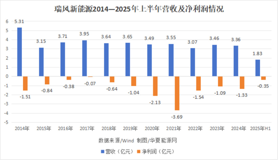 瑞风新能源是一家老牌风电运营公司,但运营状况却堪忧。华夏能源网注意到,目前瑞风新能源已连亏11年,市值仅11亿元左右,年营收不足3.5亿元。