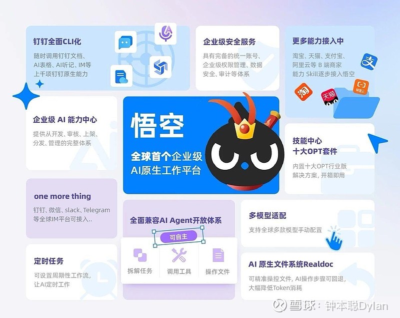 阿里巴巴发布全球首个企业级AI原生工作平台"悟空",让企业拥有全天候工作的"AI Agent军团"。该平台支持钉钉集成,具备企业级安全环境,AI Agent自动继承企业权限并在安全沙箱运行。提供云电脑版和本机电脑版两种使用方式,并推出AI能力市场构建Skill生态。阿里系B端商业能力将逐步接入,同时发布覆盖电商、跨境电商等十大行业的"一人团队"(OPT)解决方案,大幅提升工作效率。