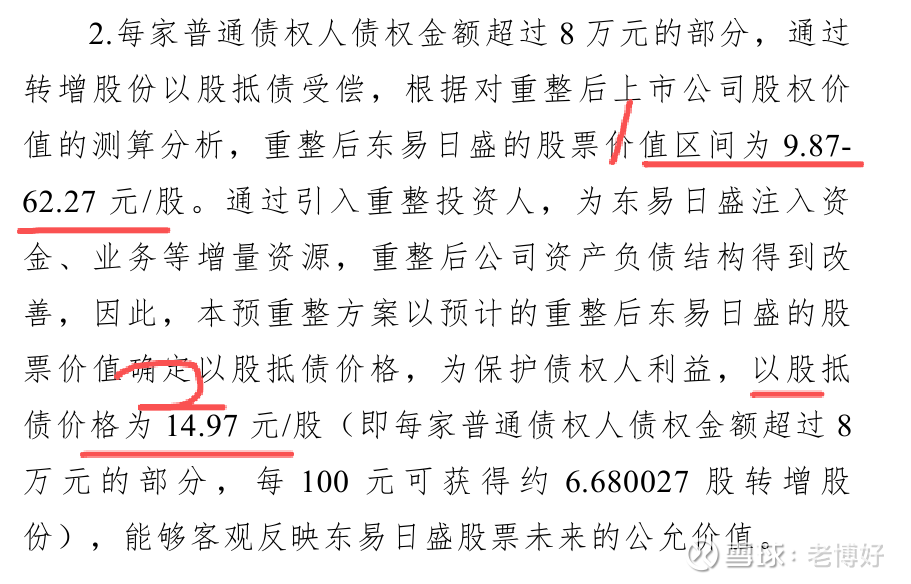 解读:文中明确提出,重整后,价值区间为9.87-62.27 元/股。按照股本9.51亿,则市值起步估值为95-570亿市值。考虑到现在市值29亿,则按照29*2.2=63亿。那么按照最最低价格估算模型计算,不考虑任何借壳、资产质量等因素,不考虑任何情绪溢价等因素,在转股前,东易最低价应该是在10.5元左右。这是我们做东易应该掌握的最最基础。