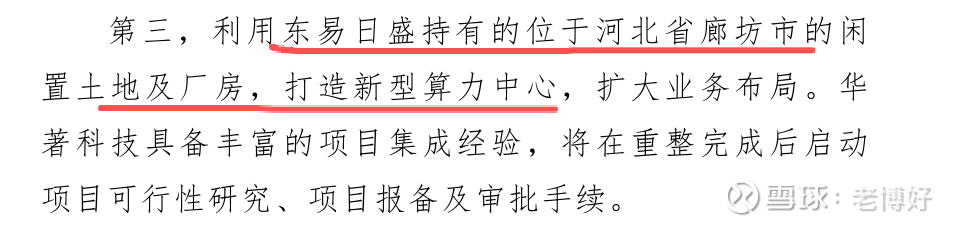 简单总结一下,我认为东易是重整股中的精品,历年重整股中,1有股票股本过大或市值过大(东易目前只有29亿),2有股票没有明确的资产注入计划(很多只是财务解困),3有股票有注入计划,但遥遥无期或者资产质量实在一般(这样的太多)等。所以,像东易这样,注入资产数量庞大,质量超级高(风口的算力资产),且属于免费注入且伴随业务订单直接注入,时间明确(一年内)的极品借壳概念股确实属于少见!