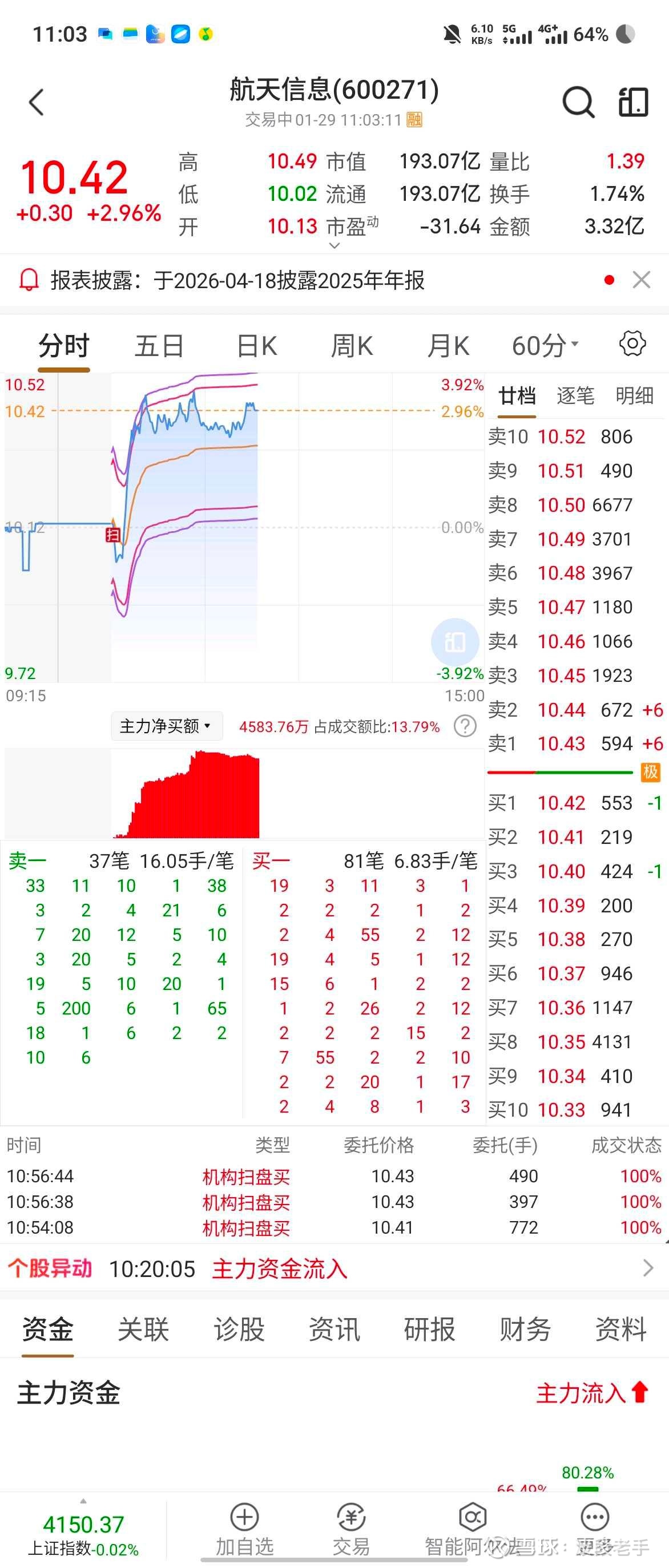 今天航天信息走势亮眼,截至11:03,股价10.42元,上涨2.96%。
