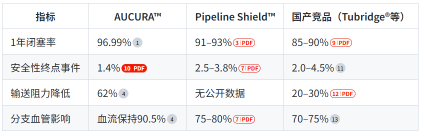 竞品对比:美敦力 Pipeline Shield™ 虽含磷酸胆碱涂层,但临床数据显示其血栓事件率仍高于 AUCURA(1.4% vs. 2.5–3.8%)[[3]][[4]];其他国产产品(如 Tubridge®、Lattice®)均无抗栓涂层设计。
