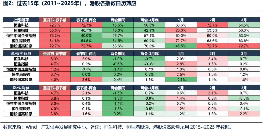 港股春季躁动(圣诞节前~春节前)与A股春季躁动时间(春节后-两会期间)有明显时间差异。将图表也分享如下,可以看到在过去2011年至2025年时期,港股对应关键指数上涨的概率均有70%以上。其中,恒生科技的弹性最大,平均的涨幅可达6%+。