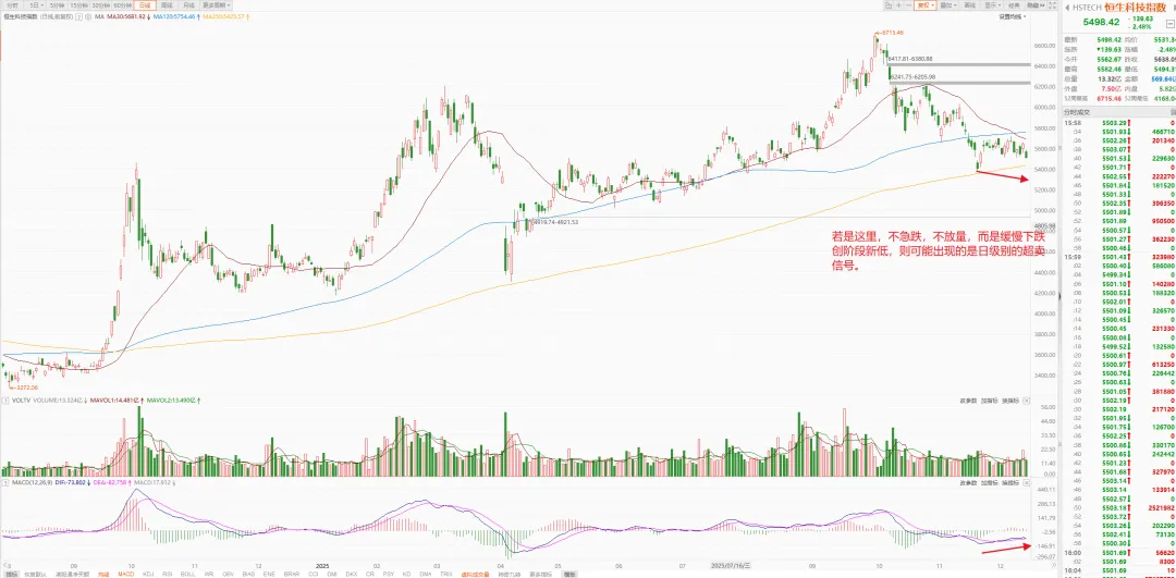 就这样,恒生科技指数走势,这一波又开始挑战年线了。若是这里,不再急跌,只是缓慢下跌,没有放巨量那种,是有可能出现日级别底背离,超卖的信号。再加上年线支撑的位置,到时是有可能会有一波反弹的。