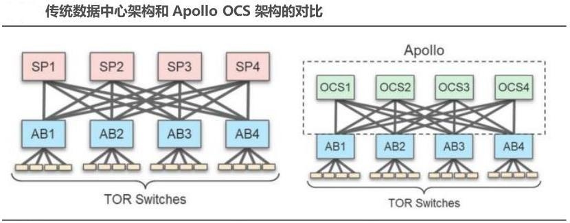 谷歌内部项目Apollo,在其数据中心大范围部署MEMS型OCS替换EPS,带来了数据中心网络架构的重大变革。传统架构中信号经过Spine层会涉及到电信号与光信号的多次转换,每一个数据包的信号处理,都会带来非常大的功耗开销,并且增加了数据的延迟。由于网络数据量的剧增,每隔两三年,Spine层都需要进行一次升级,带来了巨大的成本开销。谷歌Apollo项目,直接将SP层的EPS替换为OCS,主要是为了降低功耗与成本。