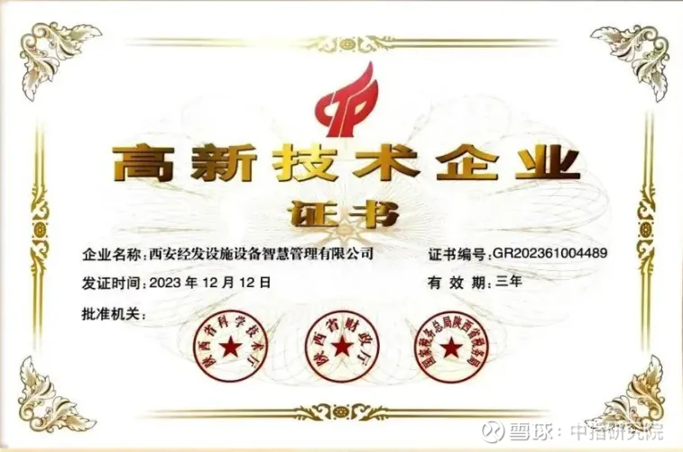 近年来,经发物业获得与“智慧城市服务支撑技术”有关的33项核心知识产权中,技术类专利18项,国家知识产权软件著作权15项。2023年底,西安经发设施设备智慧管理有限公司通过“国家高新技术企业”认证,经发物业研发实力和自主创新能力持续走在行业前沿。