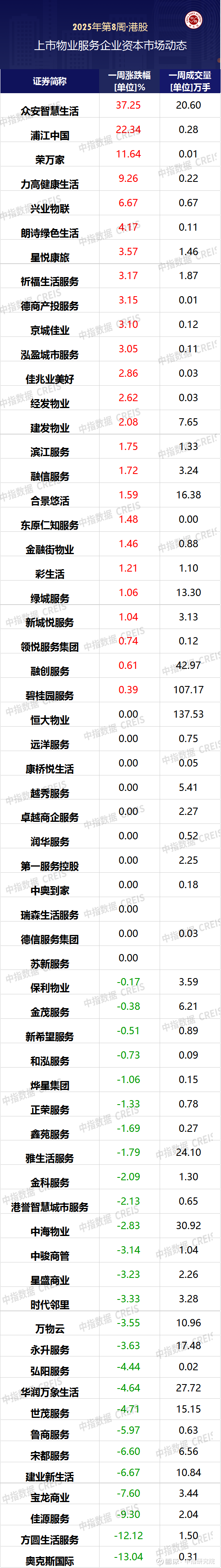本周,香港恒生指数共上涨857.59点,涨幅3.79%,本周物业服务企业共有25家股价出现上涨,众安智慧生活上涨37.25%,位列本周港股涨幅第一。浦江中国本周收获22.34%涨幅,位列本周港股涨幅第二位。